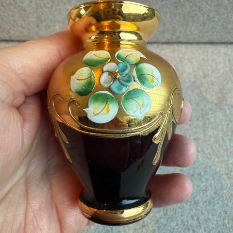 Smukke, italienske vintage solifleur vaser i flot, farvet Murano kunstglas i rød, grøn og blå og med håndmalede gulddekorationer.