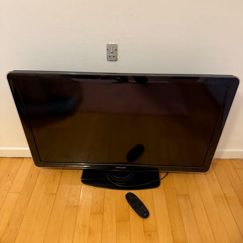 Philips BDL4330QL/00 fladskærms-tv med en skærmstørrelse på 43 tommer, der virker som den skal. TV'et har en fladskærmsdesign og er med fjernbetjening.