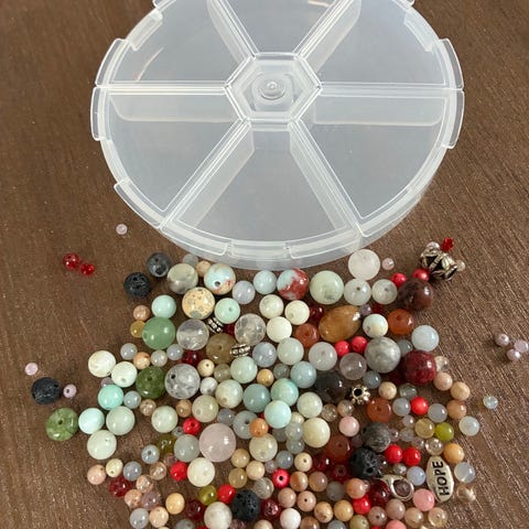 Sæt med perler i forskellige størrelser og farver, herunder grønne og hvide nuancer. Perlerne er opbevaret i en plastikæske med adskilte rum for nem organisering og brug. Velegnet til smykkefremstilling og kreative hobbyprojekter.