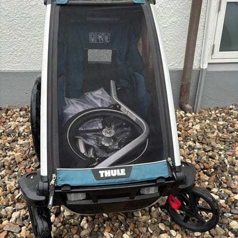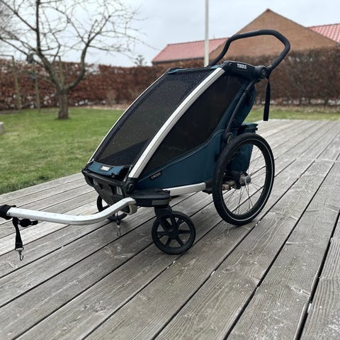 Thule chariot cross 1 blue single til et barn. Der medfølger både arm til montering på cykel samt cykelbeslag, all-terrain kit så det bliver til en løbevogn og små forhjul så den kan bruges som klapvogn, samt flag. Sædet kan lægges ned og den har justerbar affjedring. Den har et stort lastrum som kan foldes op så man ikke støder på når vognen bruges som løbevogn. Jeg har repareret et lille hul i nettet og den er blevet en anelse jordslået på ryglænet fordi jeg havde den stående under halvtag kortvarigt. Se billeder. Ellers har den været opbevaret inde. Kan også afhentes i Rungsted kyst