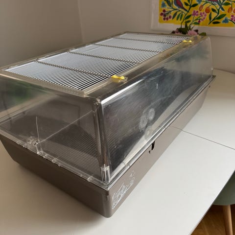 Sælger et hamsterbur med grå plastbund og gennemsigtigt låg.