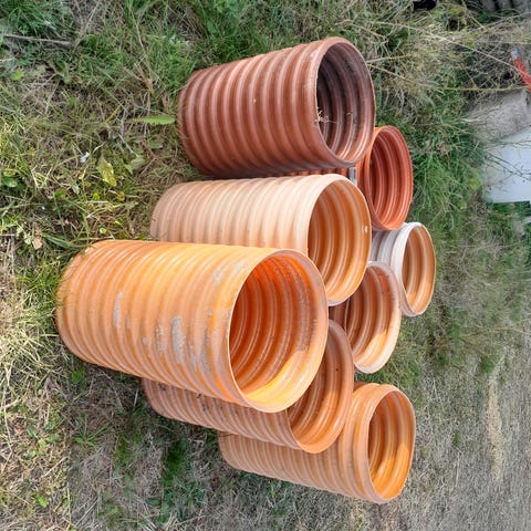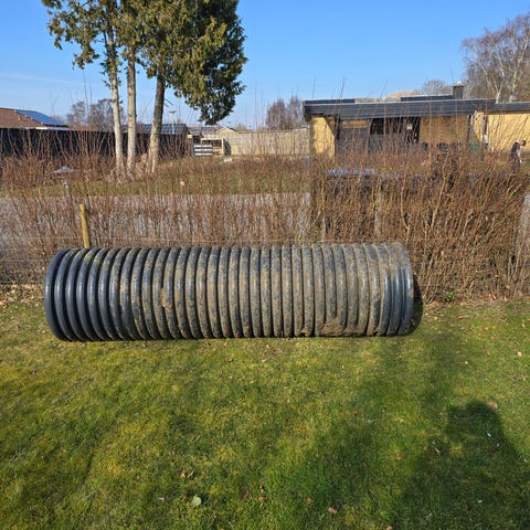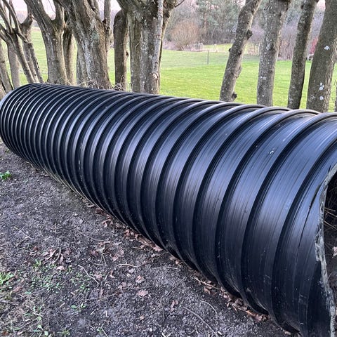 Underføringsrør til dræn under vej. Dobbeltvægget og derfor trykresistent overfor tungt maskineri