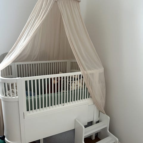 Der medfølger madras, som passer hertil fra Sebra. Og 2x tremmesider, som skal bruges til baby-sengen.