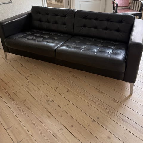 Sort læder sofa, meget lidt brugt. Den er meget let at bære, og passer ind i en elevator. Den har været min standby sofa indtil jeg fik købt en sovesofa. Er rigtig behagelig at sidde i, og nem at rengøre.