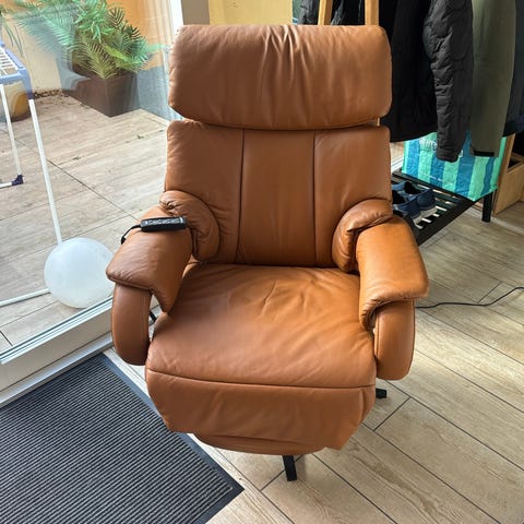 Genial hvilestol med løftefunktion. Har været en uvurderlig hjælp til en senior med nedsat kraft i benene ( var også værdsat af hjemmeplejen) Koksgrå stof, fra røgfrit hjem med kat, er blevet brugt med et tæppe over stoffet og fremstår derfor meget velholdt. Knap 3 år gammel