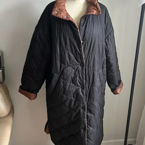 Fin quiltet frakke, let og samtidig lun, fremstillet af 100% polyester. Denne lange jakke har et dejligt quiltet design, trykknaplukning, skrå lommer og en flot krave. Brugt KUN 1 gang, da den er købt i forkert størrelse. Fra røg og dyrefrit hjem.