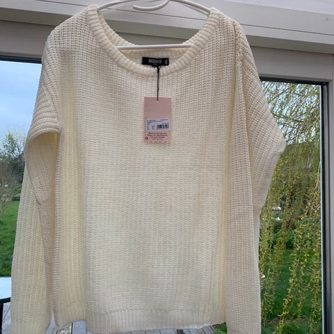 Ubrugt ribbet strikbluse i str. 38/40. Farven er bordeaux, og den har hjerteformet udskæring. Materialet er viskose og polyester. Helt ny.