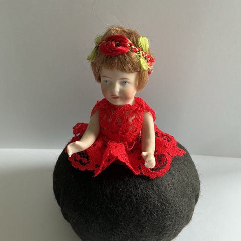 Antik porcelænsfigur med gul hæklet beklædning og kors