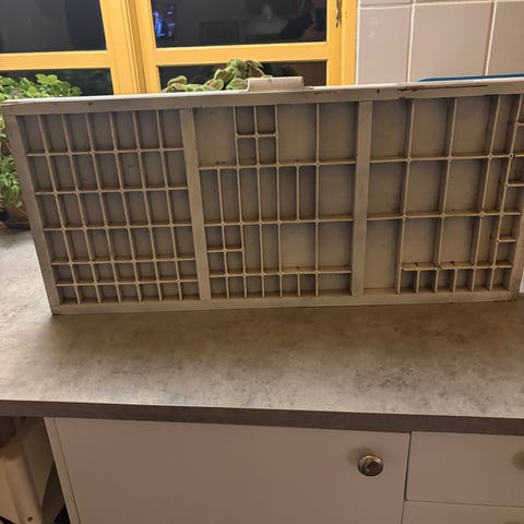 Gammel sættekasse med naturlig patina. 3 mellem rum er delvist knækkede. Se billede.