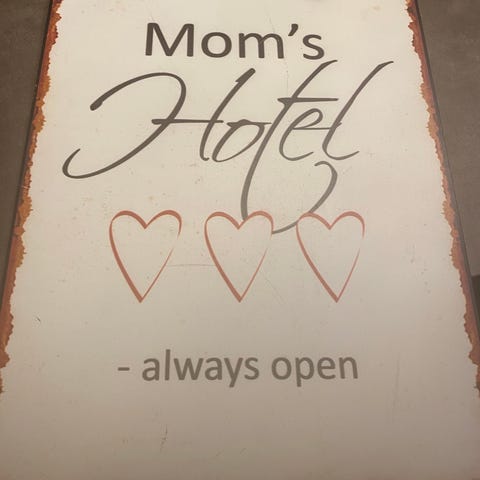 Vintage metal skilt med motiv af en kvinde i køkkenet og teksten 'Mom's Kitchen Delicious food Open Seven days'. Skiltet har et retro design og er velegnet til køkkenindretning eller som dekorativt element.