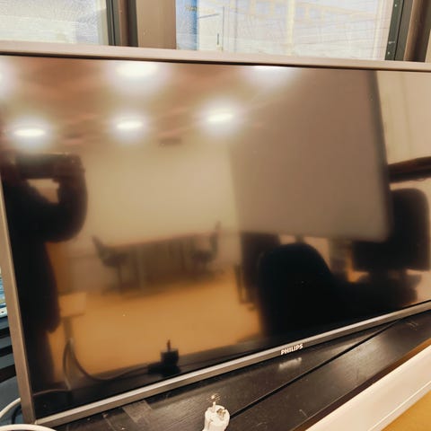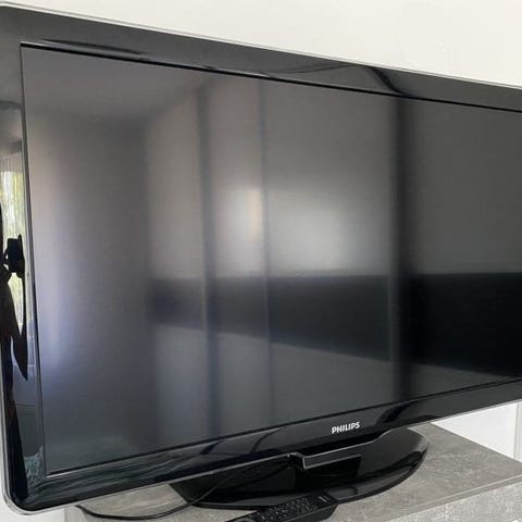 Philips TV med fjernbetjening. TV'et viser billeder med høj opløsning og understøtter forskellige apps som Apple TV og musikafspilning. Fjernbetjeningen har standardknapper til navigation og kontrol af TV-funktioner.