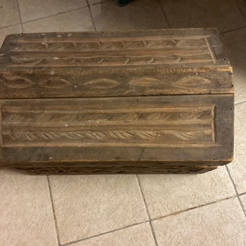 Antik trækiste fra 1849 med buet låg og håndmalet blomsterdekoration på ydersiden. Kisten er udført i træ og har metalbeslag og håndtag på siderne. Indvendigt er kisten ubehandlet træ. Velegnet til opbevaring af større genstande. Har været brugt til sengetøj mm. H70 L138 B64