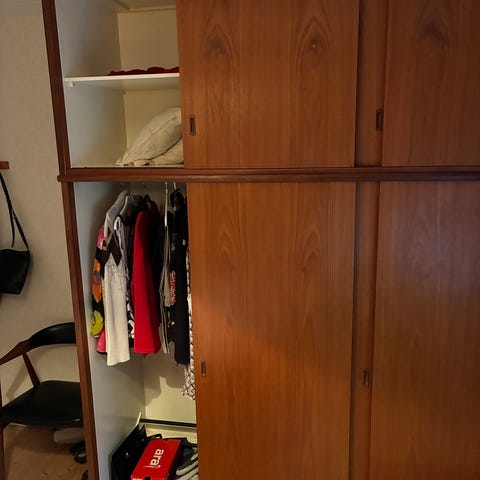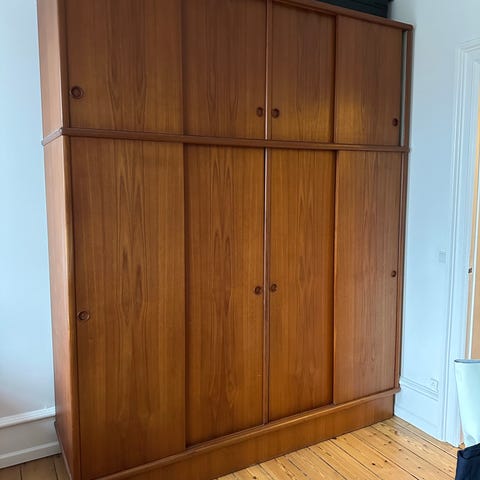 Stort garderobeskab i teaktræ fra 1960’erne. Skabet har 3 skydedøre forneden og 3 skydedøre foroven. Underskabet er delt i 3 sektioner, midtersektion på ca 40cm i bredden har 5 hylder og en skuffe, de to sektioner på hver side har begge bøjlestang.