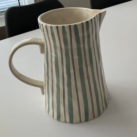 Riflet kande og krydderiglas i porcelæn med blå blomstermønster. Sættet består af en kande med hank og et krydderiglas med låg, begge dekoreret med traditionelt musselmalet 2stk 100