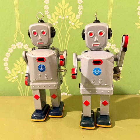 Robot legetøj figur i sort og rød farve med detaljer som knapper og hjul. Figuren har et firkantet design med en kombination af sort, rød og sølvfarvet materiale. Egnet til samling eller leg.