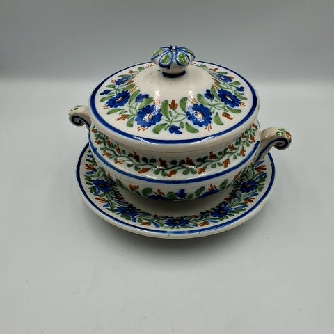 Dette produkt er en oval skål med låg, dekoreret med blå blomsterdesign. Den er fremstillet af porcelæn og har håndtag på siderne.