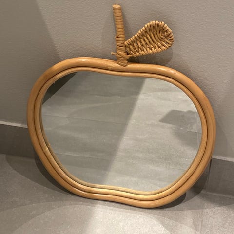 Vægspiegel af rotting og bambus vævet med glas, italiensk produktion fra 1970’erne, oprindelse EU, god stand med let aldrings- og pletrande spor, mål 83 × 55,5 × 3 cm. Klik på den blå "gå til varen" knap, for at købe eller byde på denne vare. Den samlede pris vil blive vist inden du afgiver dit bud.