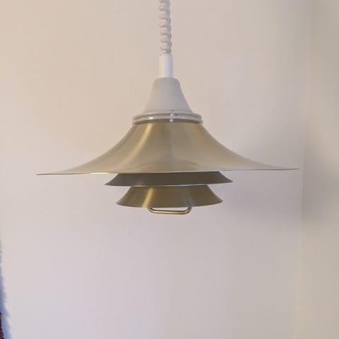 Denne hængelampe fremviser en midt-20. århundredes nordiske designæstetik, med trælameller arrangeret i en cylindrisk form og dekorative træperler. Lampen sandsynligvis daterer sig fra 1960’erne til 1970’erne, hvor naturlige materialer og håndlavede belysningsarmaturer var særligt populære i indretningen. Designet afspejler den organiske modernisme-bevægelse, der understregede naturlige materialer og håndværk. Denne type lampe tiltaler samlere af midt-20. århundredets design og nordisk design på grund af sin varme, naturlige æstetik og håndværksmæssige kvalitet. Den træbaserede konstruktion og geometriske mønster