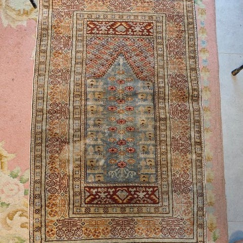 tyrkisk bønteppede af uld på uld, oprindelse Tyrkiet, begyndelsen af det 20. århundrede, måler 170 x 140 cm, i diskret generel tilstand med tegn på aldersrelateret slid. Klik på den blå "gå til varen" knap, for at købe eller byde på denne vare. Den samlede pris vil blive vist inden du afgiver dit bud.