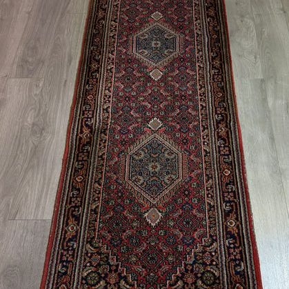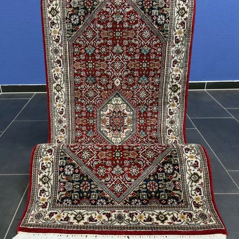 Oprindelse: Indien; Model: Bidjar håndvævet orientalsk tæppe, ca. 146 × 73 cm. Klik på den blå "gå til varen" knap, for at købe eller byde på denne vare. Den samlede pris vil blive vist inden du afgiver dit bud.