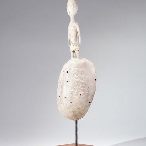 En Prampram-maske fra det sydlige Ghana, med en prampram-dukke som krone på toppen. Tegn på ritual brug og alder.
