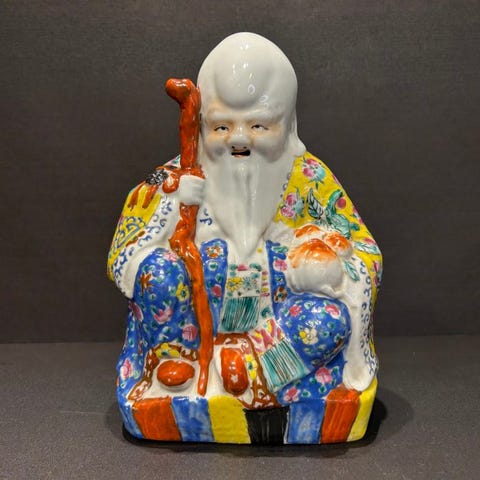 Et meget smukt antikt kinesisk porcelænsbillede af en udødelig taoist fra de otte udødelige. Denne udødelige taoist bringer lykke, rigdom og velstand ind i det nye år. Billedet er fra 1700-tallets Yongzheng-periode. En meget smukt udført figur med udstråling. Udstyret med polykrom farve.