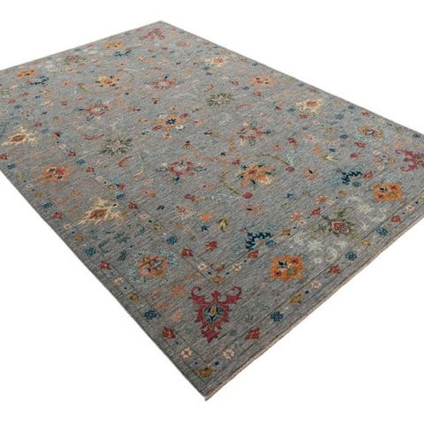 Den blide gråbeige bundfarve danner den perfekte scene for en række fint afstemte farveakcenter i turkis, blå, rust, guld, grøn og creme. De florale og symbolske elementer er yderst præcist udarbejdede og giver tæppet en elegant dybde samt en næsten tekstilagtig lethed.