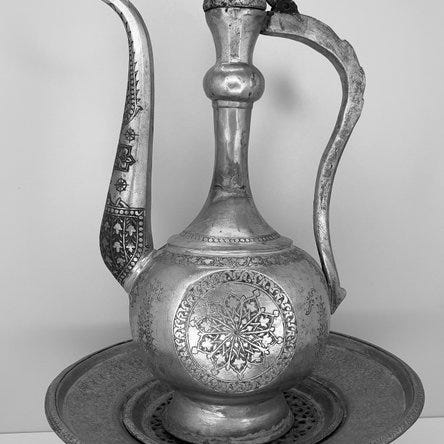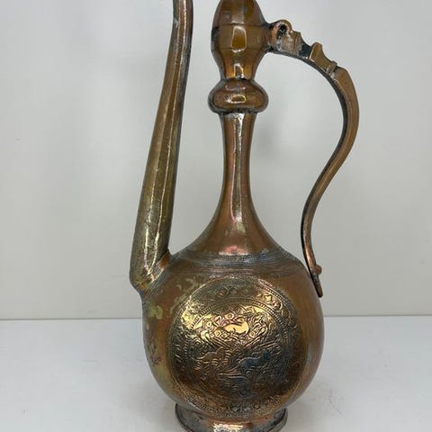 Et enestående antikt kobberbassin fra Qajar-perioden (det 19. århundrede), rigt dekoreret med fine håndindgraverede motiver, der er arrangeret i koncentriske rækker. Denne store beholder, som traditionelt kendes som en Badiyeh, blev brugt både i hjemmet og ved ceremonielle lejligheder.