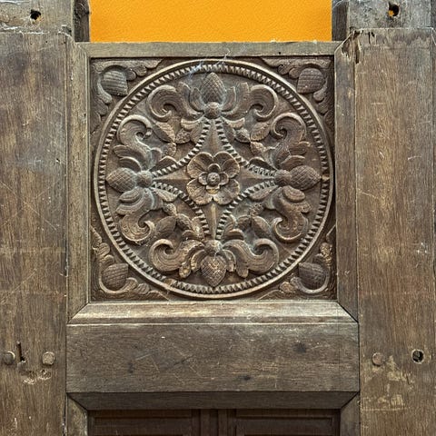 Vi tilbyder Dem: tre smukke 18. århundredes udhuggede massivt træpaneler. Vi købte disse paneler fra en hollandsk diplomat i Indien. De stammer fra et nedrevet hus i Indien fra det 18. århundrede. Træsnittene er usædvanlig smukke. To planker hører sammen (samme udsmykning), og en meget tykkere planke fra det samme hus. I betragtning af deres alder er alle tre planker i fremragende tilstand. Flotte at hænge op i et interiør eller at genbruge som et særligt bygningselement. Sammen vejer plankerne mellem 11 og 12 kg.