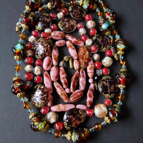 To kæder med originale venetianske Murano-perler. En kæde med genstrængede Millefiori-perler og en kæde med antikke genstrængede stribede Murano-perler i grøn. Længderne på kæderne er 58 og 66 cm, og perlerne er i god stand.