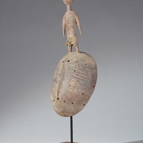 En Prampram-maske, Ghana, med en Prampram-dukke på toppen. Tegn på rituelt brug og alder. Inkl. stand.