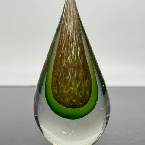 Håndblæst glasdråbeformet skulptur med farvegradient fra smaragdgrøn til turkisblå, 18 cm høj, 11 cm bred, 8 cm dyb, vejer 1,1 kg, unsigned, sandsynligvis italiensk oprindelse (Murano/Venedig), dekorativ skulptur med aldersrelaterede slidstyrker. Klik på den blå "gå til varen" knap, for at købe eller byde på denne vare. Den samlede pris vil blive vist inden du afgiver dit bud.