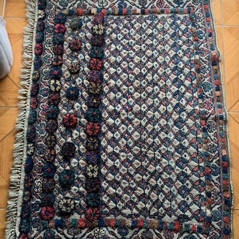 Håndlavet kunsthåndværk vævet i hånden med 90% uld, silke og bomuld på et lodret væv.