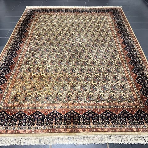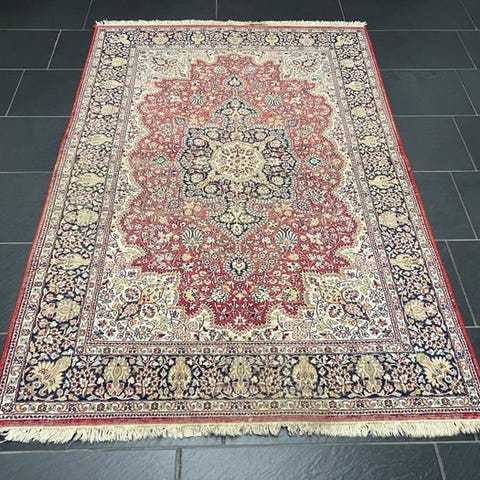 Dyk ned i den tidløse elegance af et antikt kaschmir Ghoum-orientteppich – håndknyttet med den højeste kunstfærdighed, fortæller det historier fra tidligere epoker og tilføjer dit hjem et strejf af orientalsk luksus. Dette mesterværk af håndværk fascinerer ikke kun gennem sin betagende farvepalette og detaljerede mønstre, men også gennem den kulturelle dybde, der er vævet ind i hver knude.