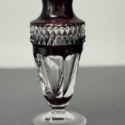Val Saint Lambert krystalvasen, Belgien, højde 22,7 cm, bredde 6,8 cm, dybde 6,8 cm, periode 1970–1980, i god stand med få slidmærker og pletter forårsaget af alder. Klik på den blå "gå til varen" knap, for at købe eller byde på denne vare. Den samlede pris vil blive vist inden du afgiver dit bud.
