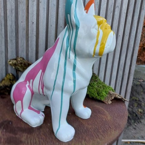 Polyresin skulptur af en fransk bulldog siddende, 31 cm høj, 23 cm dyb, 16 cm bred, oprindelse Europa, i fremragende stand, usigneret, titulert French bulldog sitting in color. Klik på den blå "gå til varen" knap, for at købe eller byde på denne vare. Den samlede pris vil blive vist inden du afgiver dit bud.