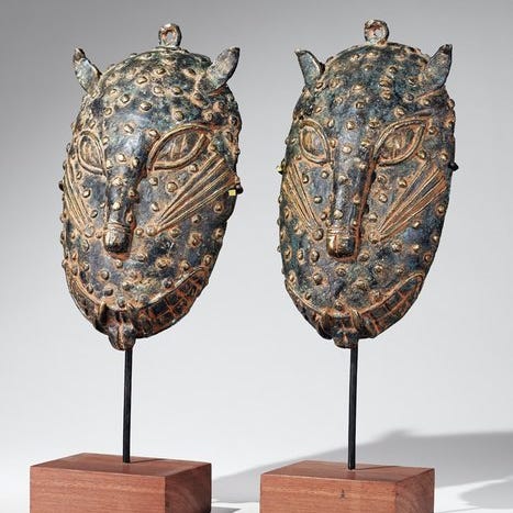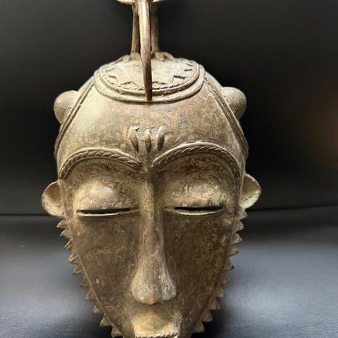 En yoruba-bronzemaske indsamlet i Ibadan, Nigeria, hvis ansigtsflade er overgået af et elefanthoved, oxideret med delvis grønlig patina; sandsynligvis fra det 18. århundrede. Inkl. stand.