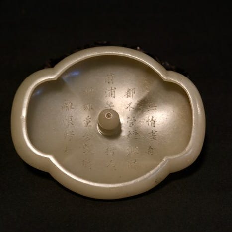 Et fint udhugget ornament af hvid hårdsten fra Qing-dynastiet. Skulpturen forestiller en ældre lærde siddende i en naturlig klippehule, flankeret af et fyrretræ ved hans side, med en indhugget bolig i baggrunden. Den klippefyldte landskabs fremstilling er gjort med stor vitalitet og dybde, der viser håndværksmæssig kunnen og en sans for naturlige former. Stykket er ledsaget af sin originale udhuggede træfod, dekoreret med klippe- og fyrretræs motiver, der harmonerer tæt med stenudskæringen. Dette værk er sandsynligvis forbundet med literati-smag og æstetik fra Qing-dynastiet. Overordnet fint udført og