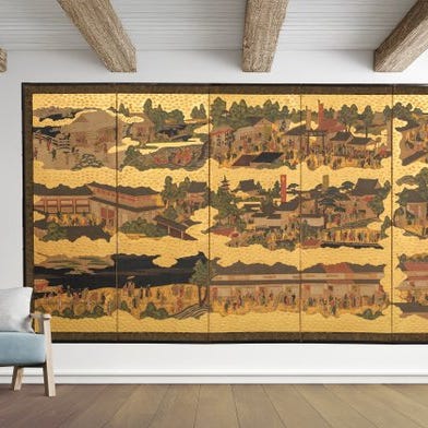 Byōbu foldeskærm - Papir - Japan - Guldbladet fyr og kraner