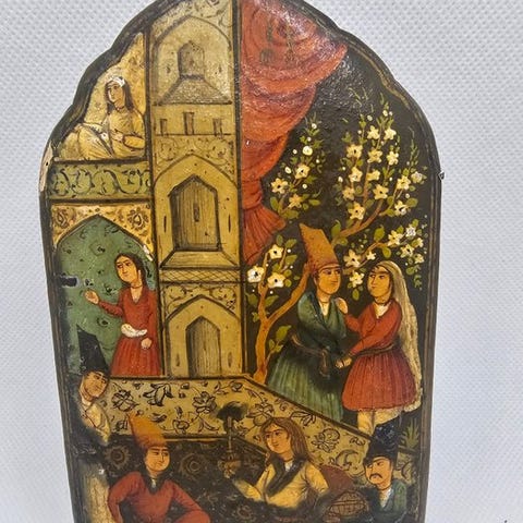 Hver overflade er omhyggeligt håndmalet og lakkeret, hvilket skaber en rig, blank overflade, der reflekterer den forfinede håndværkstradition, der er karakteristisk for den tidlige 20. århundredes Kashmiri dekorative kunst.