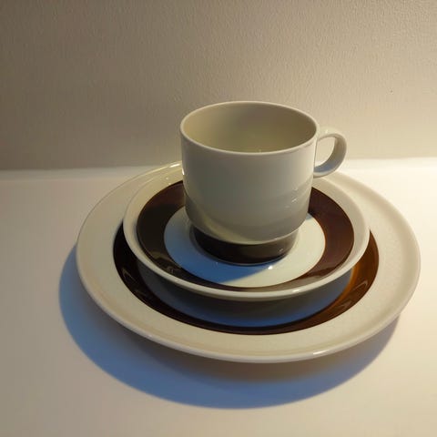 Rörstrand 'Forma' kaffeservice og dessertservice — Olle Alberius (1967–1981) - Serien er dokumenteret som en nedlagt kollektion bemærket for sin cremehvide feldspatkrop, varmt brunt bånd og subtilt relief — en nem pasform til nutidens indretning og daglig brug.