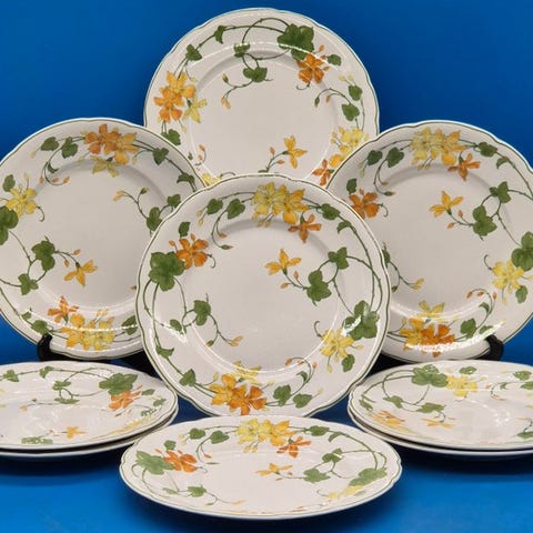 Der udbydes et eksklusivt porcelænsesæt fra Villeroy & Boch i dekorserien „Geranium“. Ensemblet imponerer med florale underglasurmalerier med gule og orange blomster samt grønne ranker.