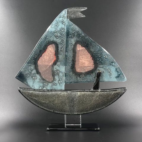 Fremstillet i klart glas med lyseblå og gule farveaccenter.