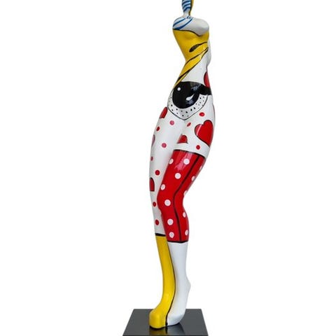 Moderne siddende kvinde. Designet i en abstrakt og nutidig stil med farverige accenter i pop art-kulturens stil. Skulpturen er lavet af glasfiber.