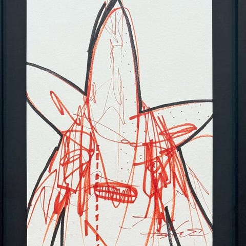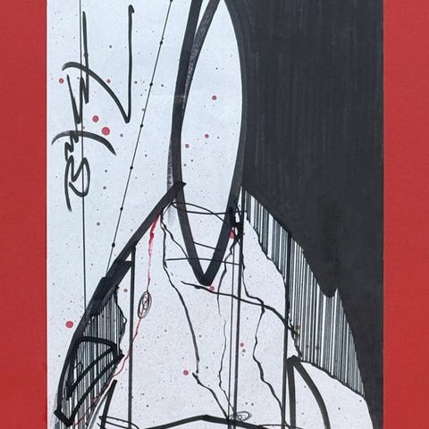 Med en mørk og kraftfuld palet, der brydes af strejf af rød og orange, er kompositionen bygget omkring en atmosfærisk overflade, der krydses af bølgende, lynlignende linjer. Selvom den nikker til elementer af lyrisk abstraktion, forbliver maleriet fast forankret i Futuras særegne visuelle sprog og maleriske tilgang.