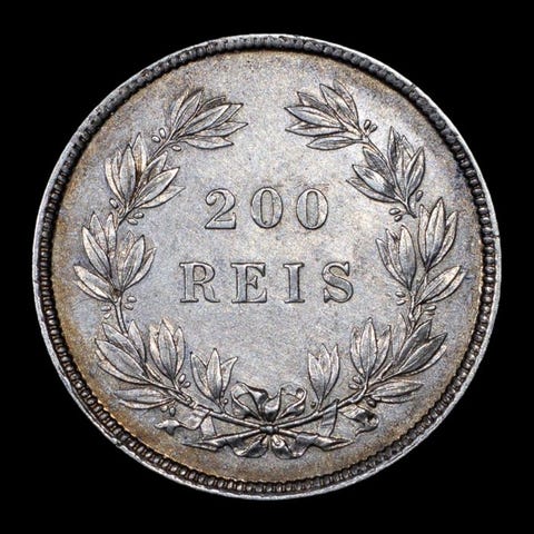 Mønt produceret på Bahia-møntværket i den periode, hvor Brasilien var en del af Det Forenede Kongerige Portugal, Brasilien og Algarve. 960 Réis-mønterne fra denne periode er kendt for at være remonetariseringer af spanske 8 realer, hvor mønterne blev overvurderet i de luso-brasilianske territorier.