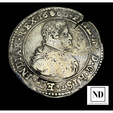 Felipe II 1/2 Ducatón fra Milanens mønt, dateret 1556/1598, vægt 15,38 g Ag, sølv, uden certifikat. Klik på den blå "gå til varen" knap, for at købe eller byde på denne vare. Den samlede pris vil blive vist inden du afgiver dit bud.