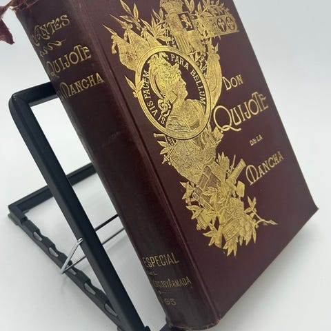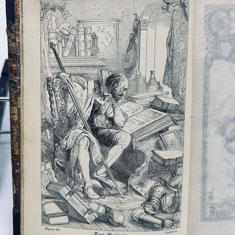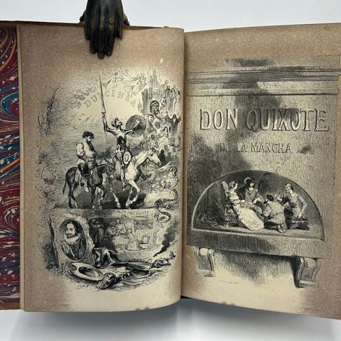 The Adventures of Don Quixote de la Mancha, oversat fra spansk af Charles Jarvis, med næsten 700 træsnit af Tony Johannot, grøn stofbindings hård ryg, 766 sider, størrelse 22,5 x 15 cm, udgivet i 1892 af Ward, Lock, Bowden and Co., i god stand. Klik på den blå "gå til varen" knap, for at købe eller byde på denne vare. Den samlede pris vil blive vist inden du afgiver dit bud.
