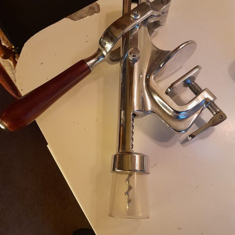 Proptrækkerens håndtag er lavet af et smukt træ og har en flot farve, og det er fastgjort til bordet.