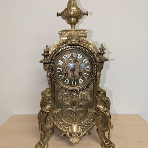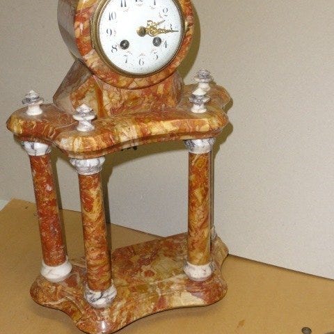 Uret er lavet af sort marmor med forgyldte detaljer. Skiven er hvid med sorte romerske tal.